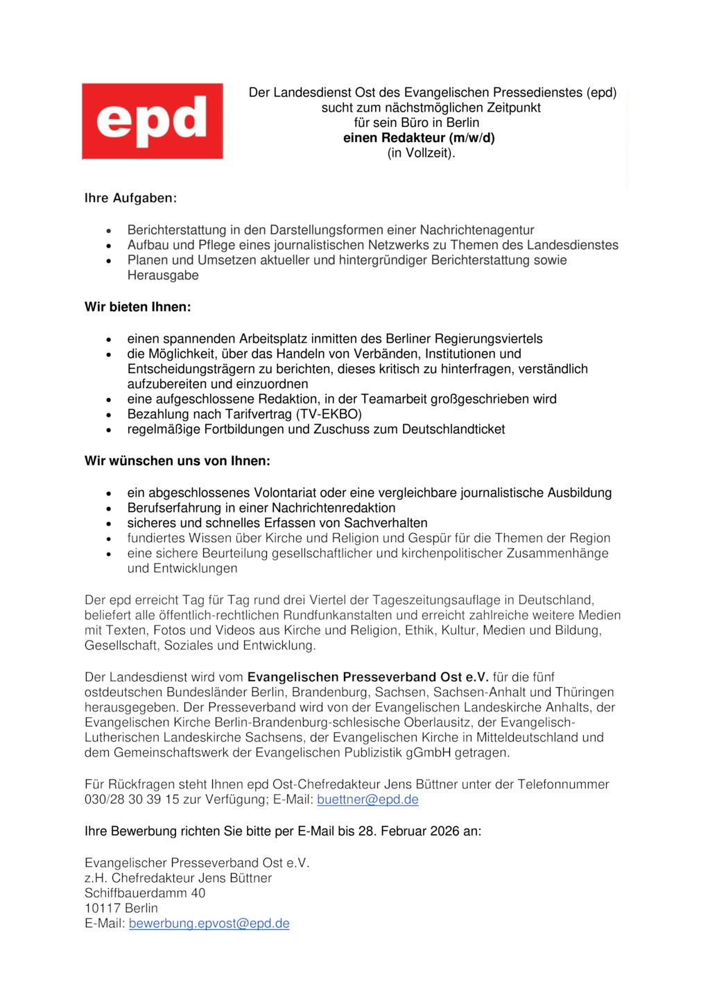 Für Rückfragen steht Ihnen epd Ost-Chefredakteur Jens Büttner unter der Telefonnummer 030/28 30 39 15 zur Verfügung; E-Mail: buettner@epd.de