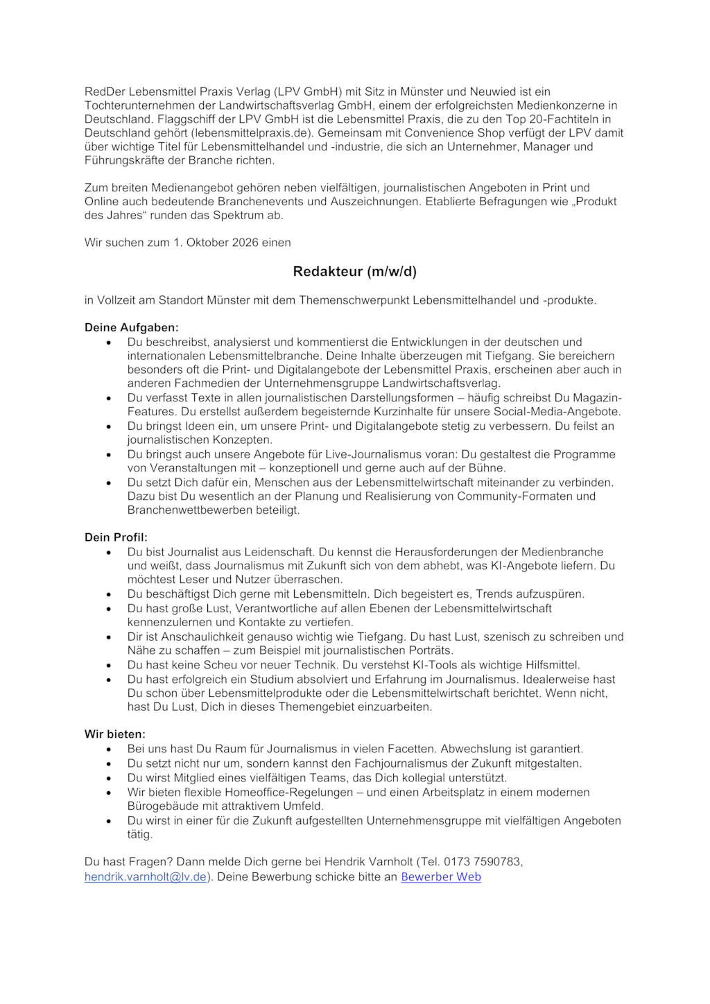 - Du beschreibst, analysierst und kommentierst die Entwicklungen in der deutschen und internationalen Lebensmittelbranche. Deine Inhalte überzeugen mit Tiefgang. Sie bereichern besonders oft die Print- und Digitalangebote der Lebensmittel Praxis, erscheinen aber auch in anderen Fachmedien der Unternehmensgruppe Landwirtschaftsverlag.