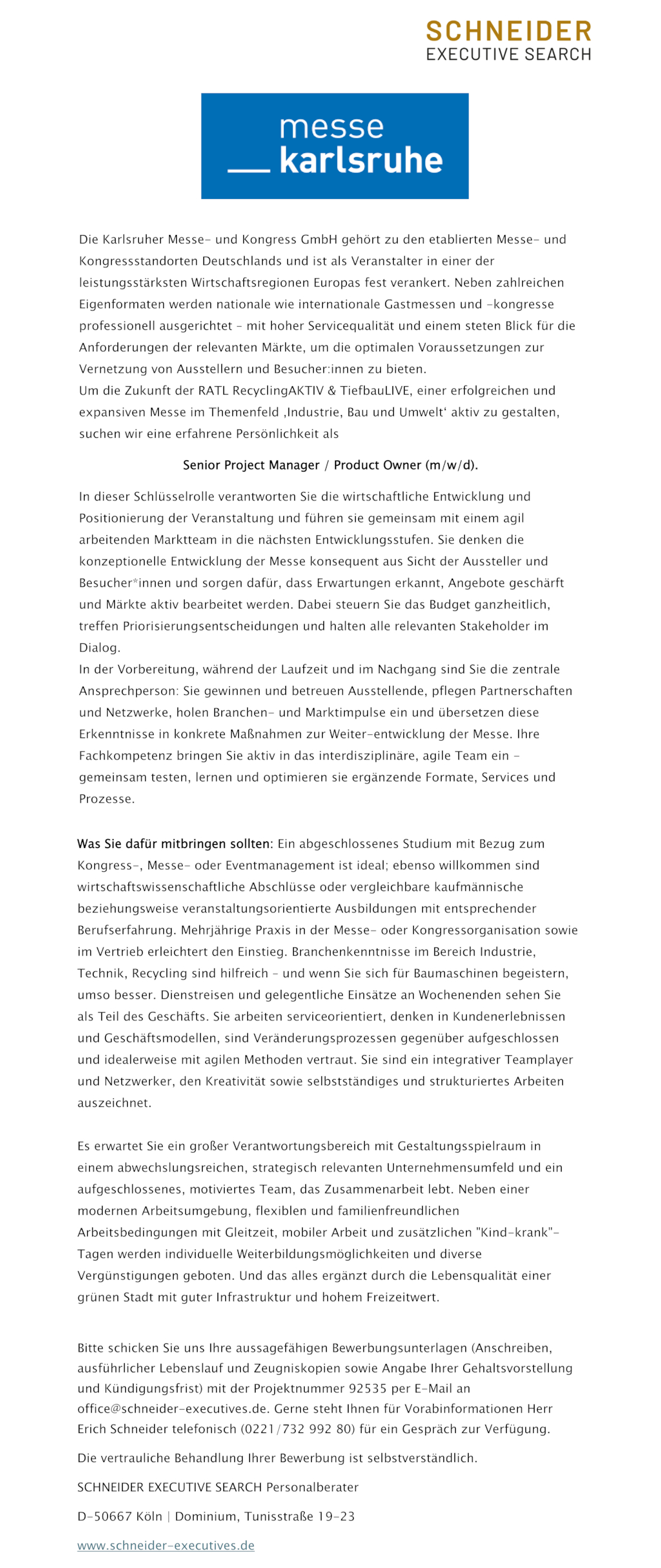 Bitte schicken Sie uns Ihre aussagefähigen Bewerbungsunterlagen (Anschreiben, ausführlicher Lebenslauf und Zeugniskopien sowie Angabe Ihrer Gehaltsvorstellung und Kündigungsfrist) mit der Projektnummer 92535 per E-Mail an office@schneider-executives.de.