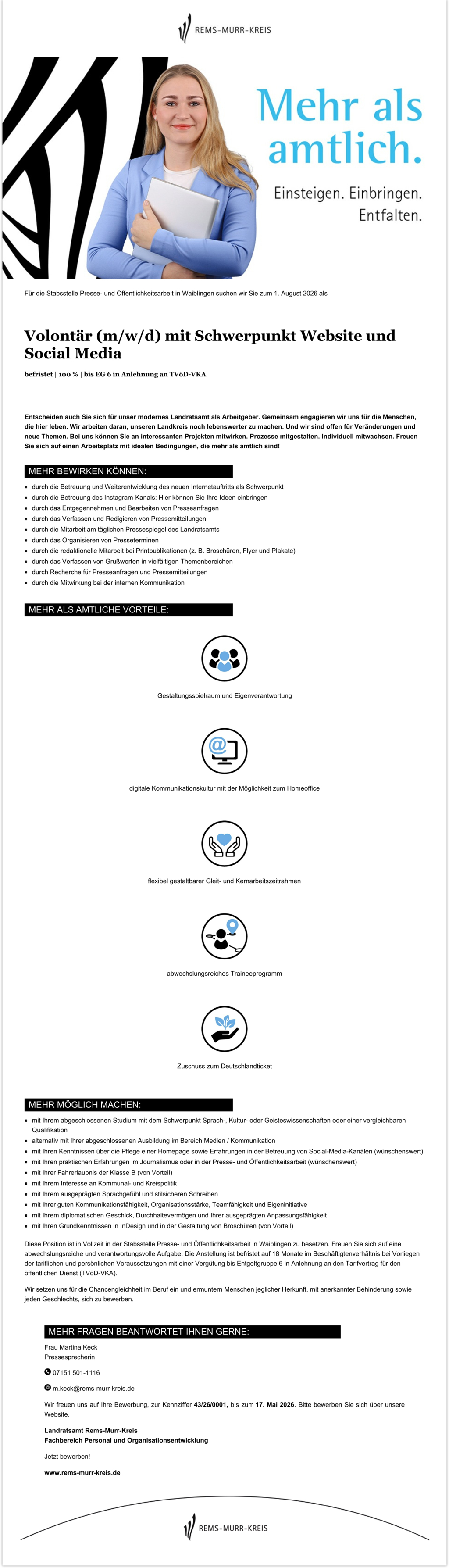 Für die Stabsstelle Presse- und Öffentlichkeitsarbeit in Waiblingen suchen wir Sie zum 1. August 2026 als