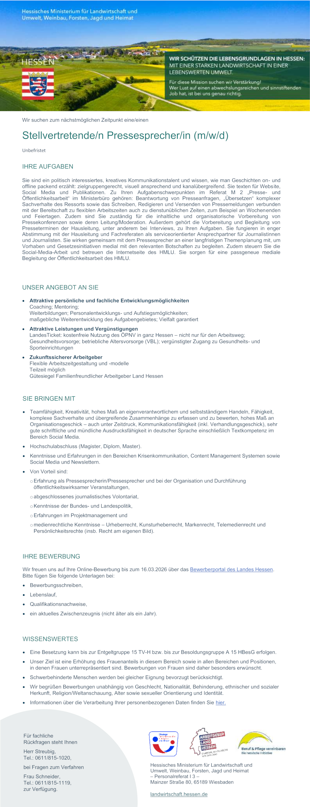Wir freuen uns auf Ihre Online-Bewerbung bis zum 16.03.2026 über das Bewerberportal des Landes Hessen. Bitte fügen Sie folgende Unterlagen bei: